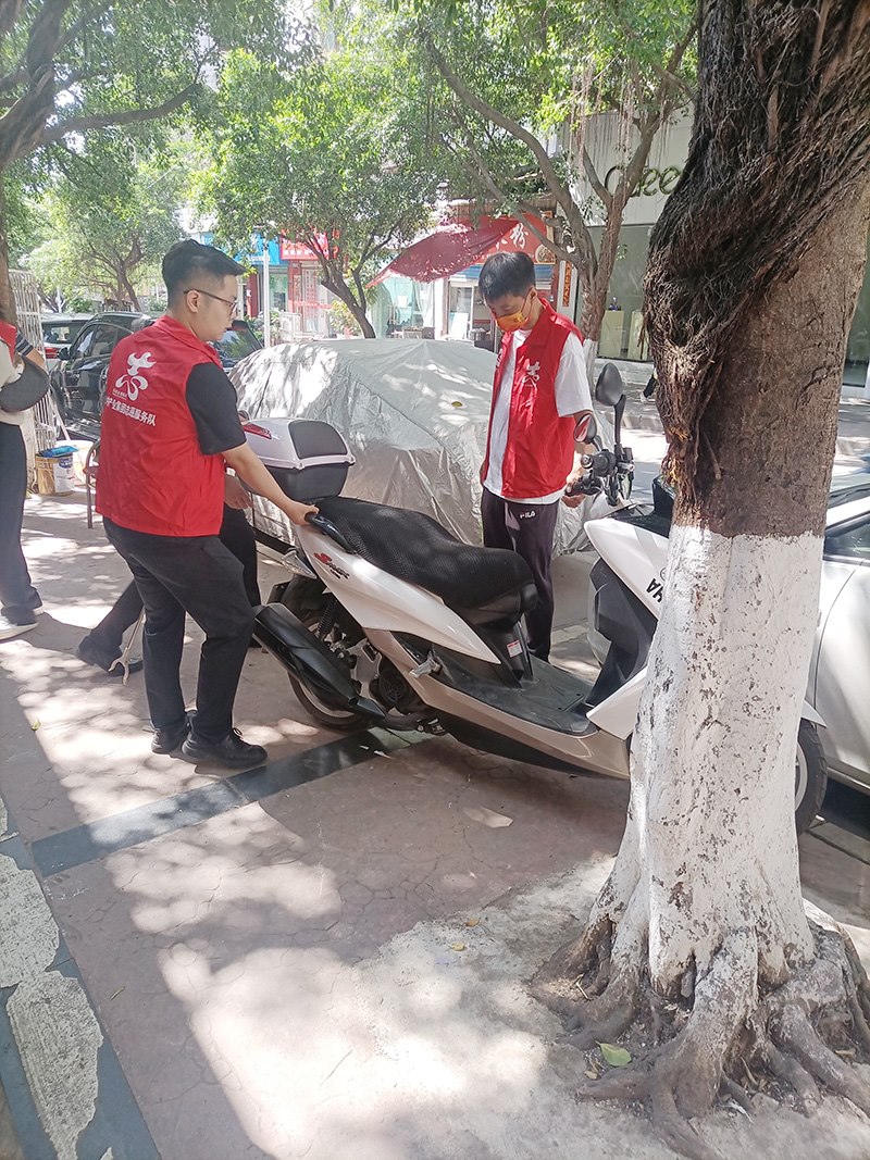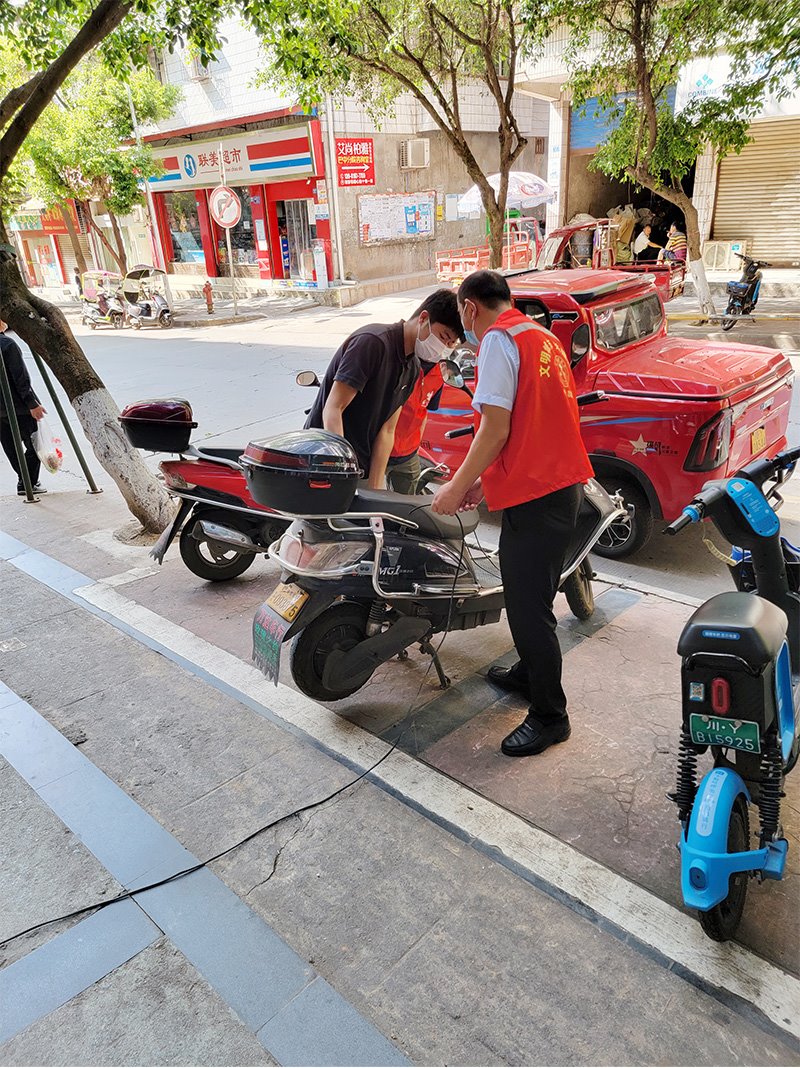 (志愿者對飛線充電的電瓶車進(jìn)行整治)