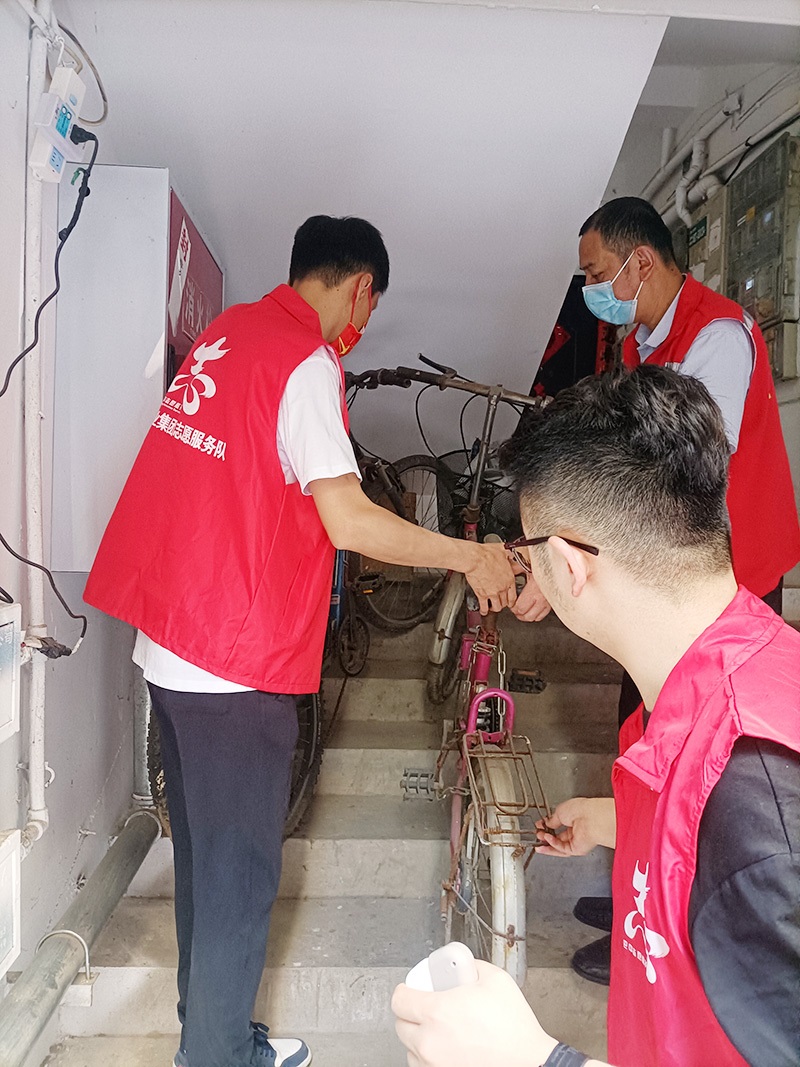 (志愿者對社區(qū)內(nèi)堆放的雜物進(jìn)行搬運(yùn)清理)