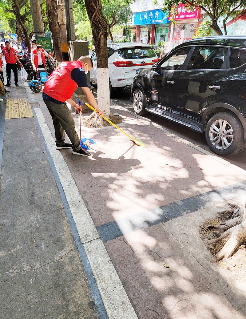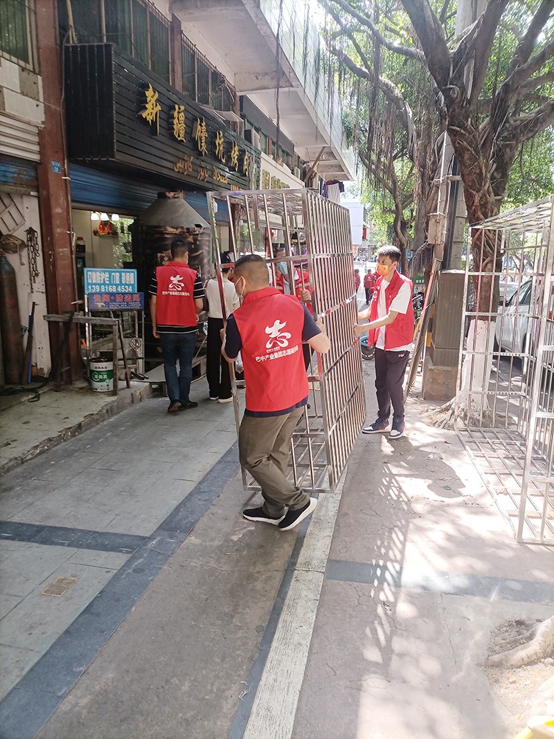 (志愿者對占道經(jīng)營的商品清理后進(jìn)行路面清掃)