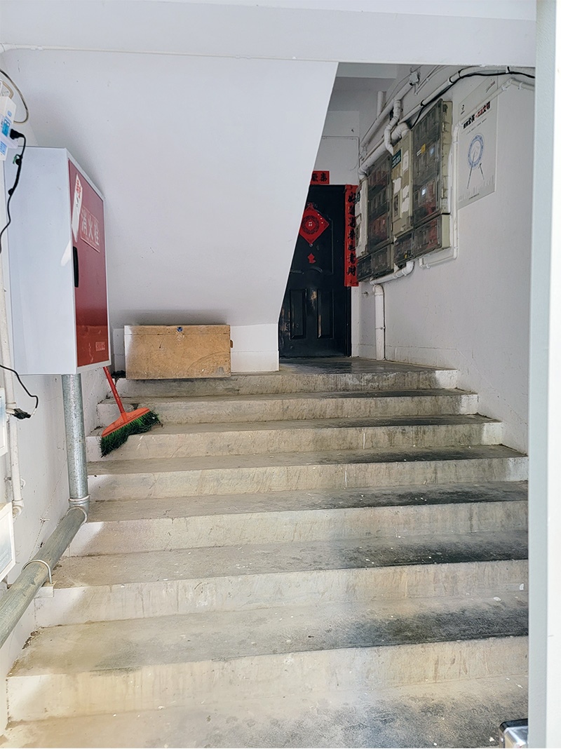 (志愿者對樓道內(nèi)堆放的雜物進(jìn)行清理)