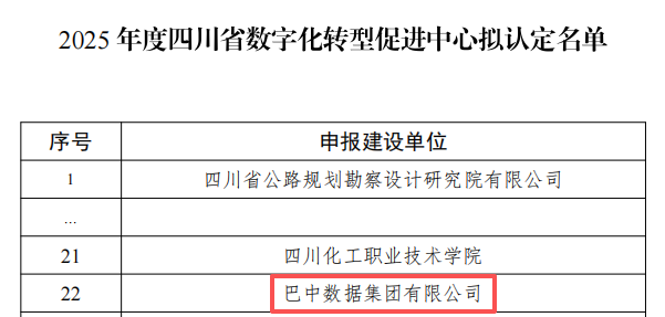 近期,根據(jù)省發(fā)改委官網(wǎng)公示,巴中數(shù)據(jù)集團成功入選2025年度四川省數(shù)字化轉(zhuǎn)型促進中心擬認定名單,系巴中首例!標志著巴中在積極融入全省數(shù)字化轉(zhuǎn)型大局、全力推進數(shù)字經(jīng)濟建設(shè)方面樹立了巴中標桿。