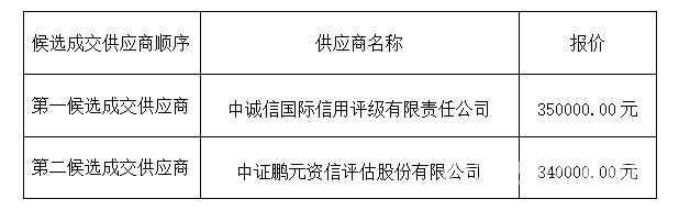 一、項目名稱:巴中市產(chǎn)業(yè)發(fā)展集團(tuán)有限公司2022年度主體信用評級服務(wù)項目二、評審結(jié)果三、成交信息成交供應(yīng)商:中誠信國際信用評級有限責(zé)任公司成交金額:¥350000.00元(大寫:人民幣